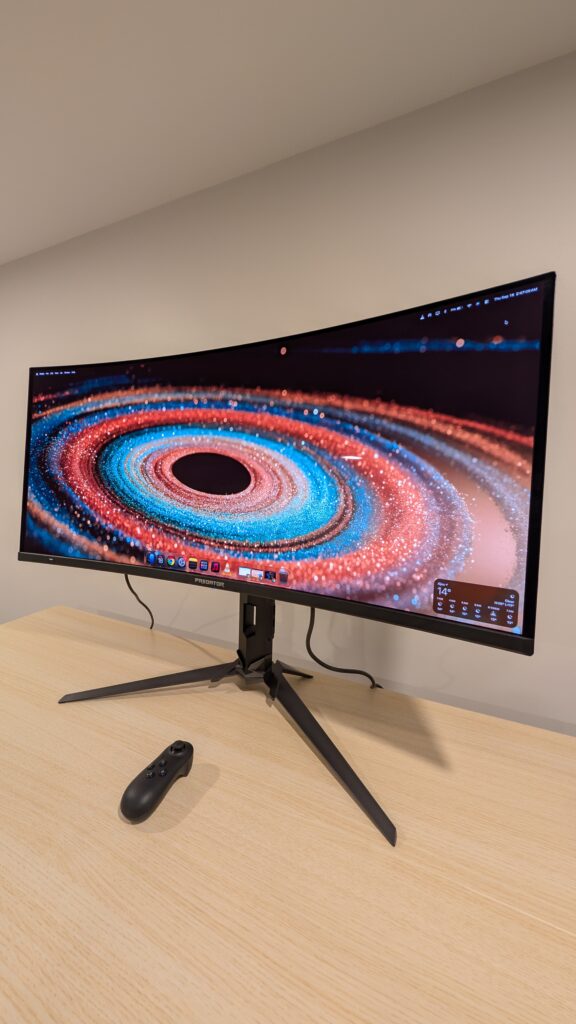 I’ve always been a fan of the Predator aesthetic, and they’ve really nailed it here. It’s still got that aggressive “gamer” DNA, but it’s been refined to feel more modern and professional. The super-thin bezels are fantastic and just melt away, making the picture feel even more immersive. The real star, though, is the stand. It’s a heavy-duty, fully ergonomic beast. I was able to easily adjust the height, tilt it up and down, and swivel it left and right to find that perfect, comfortable viewing angle for my setup. It feels incredibly sturdy and built to last.